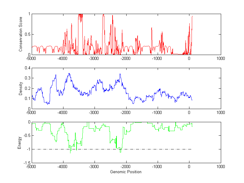 The energy profile (green curve) is about energy for module detection based on TF interaction. The positions with energy less than -1 indicate the existence of CRMs.
