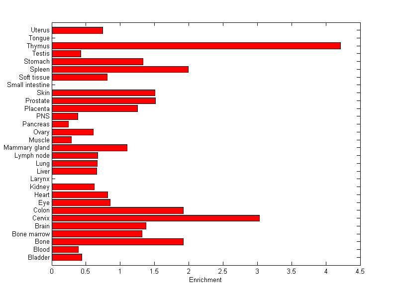 The expression level is normalized with tissue-library size. Each value for a gene in a tissue is a ratio of observed ESTs to the expected one in this tissue. The expected number of ESTs is the product of total ESTs of the gene and the fraction of total ESTs in the tissue among all ESTs in 30 tissues.