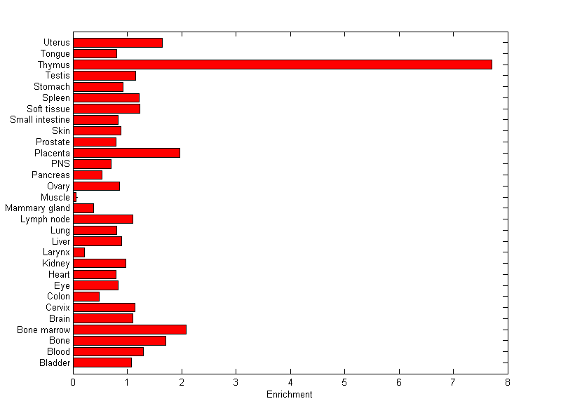 About the profile: The expression level is normalized with tissue-library size. Each value for a gene in a tissue is a ratio of observed ESTs to the expected one in this tissue. The expected number of ESTs is the product of total ESTs of the gene and the fraction of total ESTs in the tissue among all ESTs in 30 tissues. Summary: This gene is preferentially expressed in [thymus] Download: |