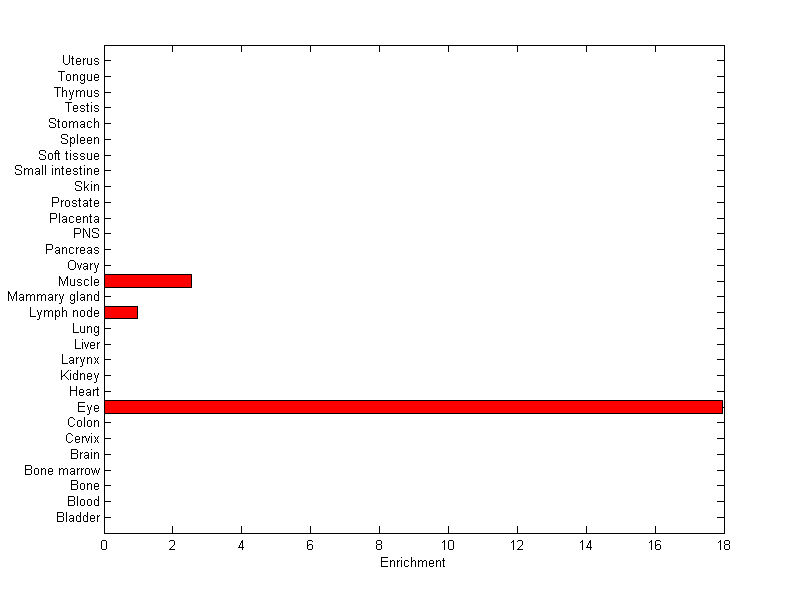 The expression level is normalized with tissue-library size. Each value for a gene in a tissue is a ratio of observed ESTs to the expected one in this tissue. The expected number of ESTs is the product of total ESTs of the gene and the fraction of total ESTs in the tissue among all ESTs in 30 tissues.