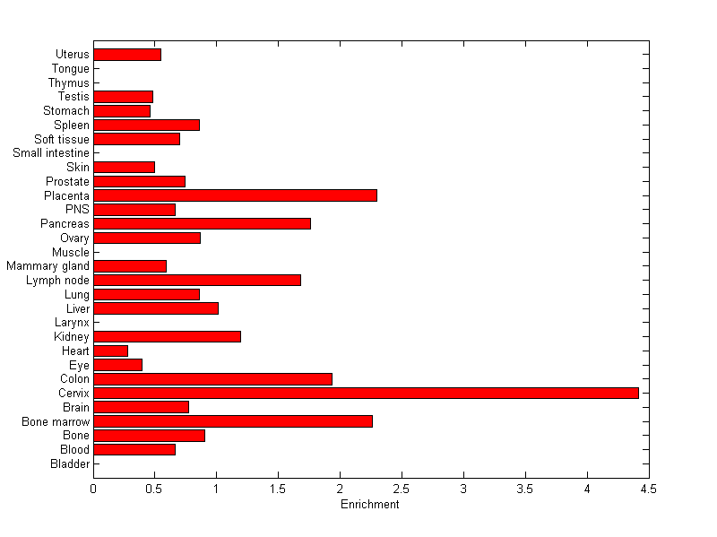 The expression level is normalized with tissue-library size. Each value for a gene in a tissue is a ratio of observed ESTs to the expected one in this tissue. The expected number of ESTs is the product of total ESTs of the gene and the fraction of total ESTs in the tissue among all ESTs in 30 tissues.