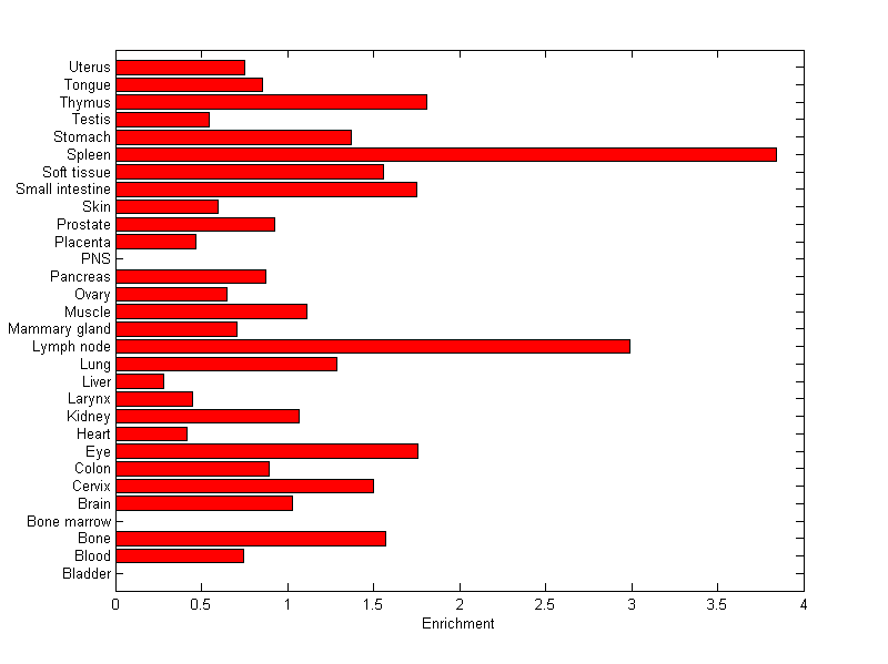 The expression level is normalized with tissue-library size. Each value for a gene in a tissue is a ratio of observed ESTs to the expected one in this tissue. The expected number of ESTs is the product of total ESTs of the gene and the fraction of total ESTs in the tissue among all ESTs in 30 tissues.