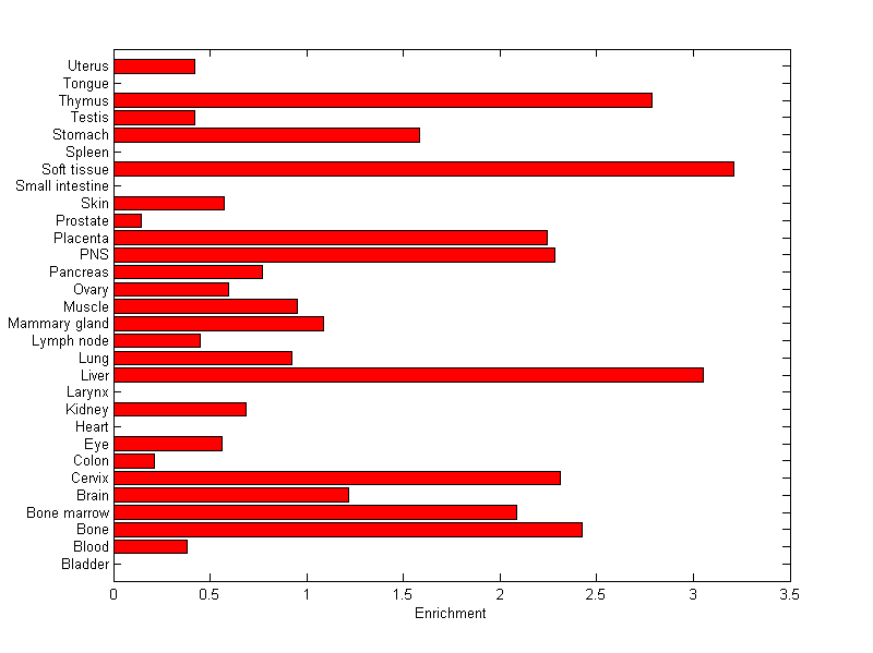 The expression level is normalized with tissue-library size. Each value for a gene in a tissue is a ratio of observed ESTs to the expected one in this tissue. The expected number of ESTs is the product of total ESTs of the gene and the fraction of total ESTs in the tissue among all ESTs in 30 tissues.