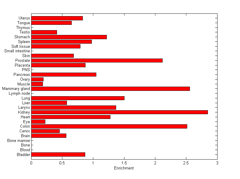 The expression level is normalized with tissue-library size. Each value for a gene in a tissue is a ratio of observed ESTs to the expected one in this tissue. The expected number of ESTs is the product of total ESTs of the gene and the fraction of total ESTs in the tissue among all ESTs in 30 tissues.