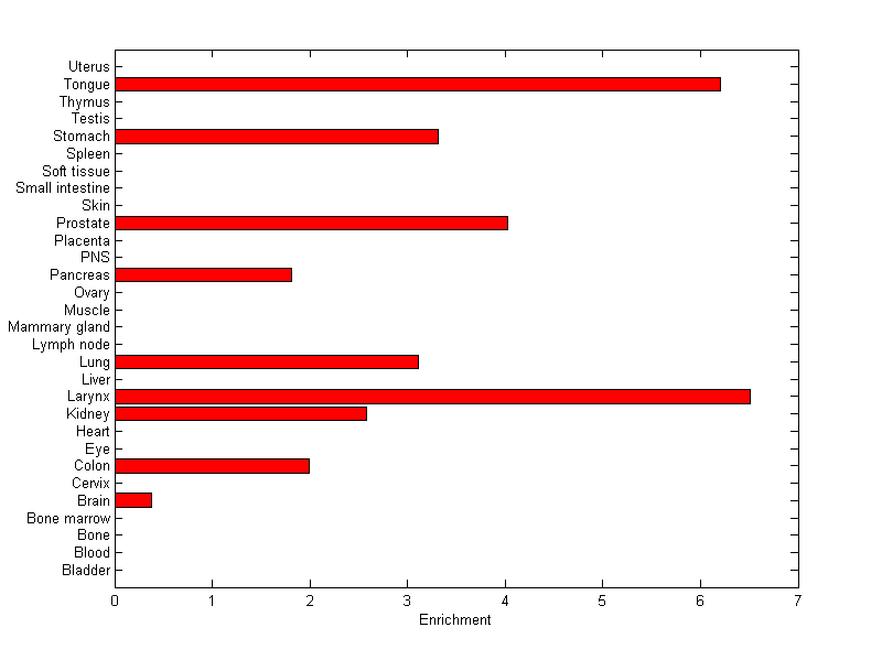 The expression level is normalized with tissue-library size. Each value for a gene in a tissue is a ratio of observed ESTs to the expected one in this tissue. The expected number of ESTs is the product of total ESTs of the gene and the fraction of total ESTs in the tissue among all ESTs in 30 tissues.
