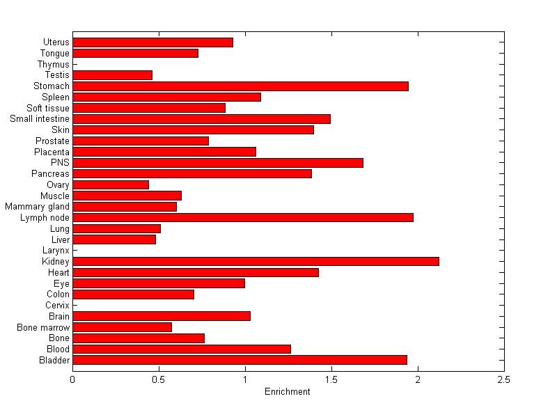 The expression level is normalized with tissue-library size. Each value for a gene in a tissue is a ratio of observed ESTs to the expected one in this tissue. The expected number of ESTs is the product of total ESTs of the gene and the fraction of total ESTs in the tissue among all ESTs in 30 tissues.