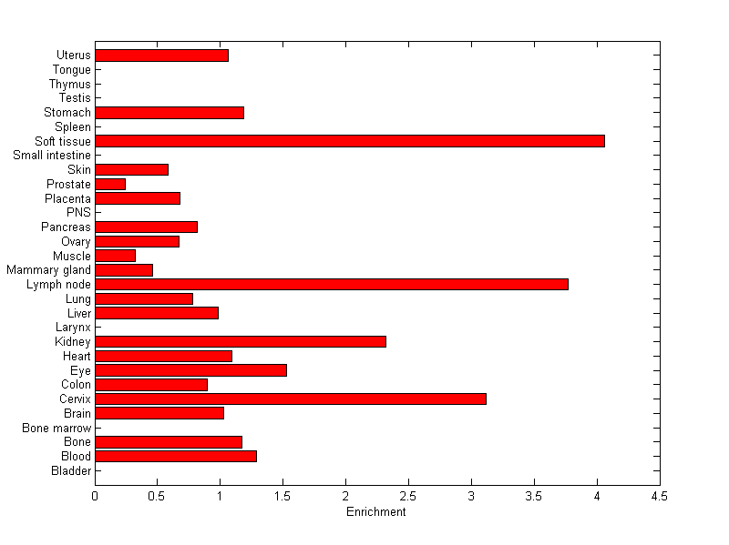 The expression level is normalized with tissue-library size. Each value for a gene in a tissue is a ratio of observed ESTs to the expected one in this tissue. The expected number of ESTs is the product of total ESTs of the gene and the fraction of total ESTs in the tissue among all ESTs in 30 tissues.