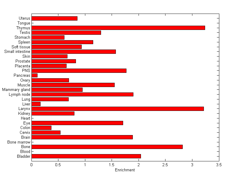 The expression level is normalized with tissue-library size. Each value for a gene in a tissue is a ratio of observed ESTs to the expected one in this tissue. The expected number of ESTs is the product of total ESTs of the gene and the fraction of total ESTs in the tissue among all ESTs in 30 tissues.