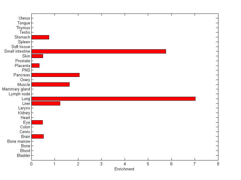 The expression level is normalized with tissue-library size. Each value for a gene in a tissue is a ratio of observed ESTs to the expected one in this tissue. The expected number of ESTs is the product of total ESTs of the gene and the fraction of total ESTs in the tissue among all ESTs in 30 tissues.
