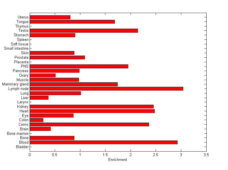 The expression level is normalized with tissue-library size. Each value for a gene in a tissue is a ratio of observed ESTs to the expected one in this tissue. The expected number of ESTs is the product of total ESTs of the gene and the fraction of total ESTs in the tissue among all ESTs in 30 tissues.