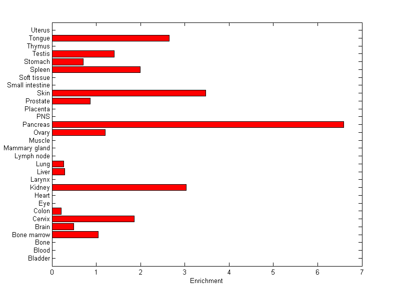 The expression level is normalized with tissue-library size. Each value for a gene in a tissue is a ratio of observed ESTs to the expected one in this tissue. The expected number of ESTs is the product of total ESTs of the gene and the fraction of total ESTs in the tissue among all ESTs in 30 tissues.