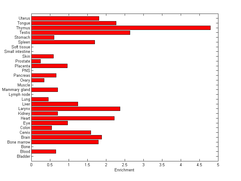 The expression level is normalized with tissue-library size. Each value for a gene in a tissue is a ratio of observed ESTs to the expected one in this tissue. The expected number of ESTs is the product of total ESTs of the gene and the fraction of total ESTs in the tissue among all ESTs in 30 tissues.