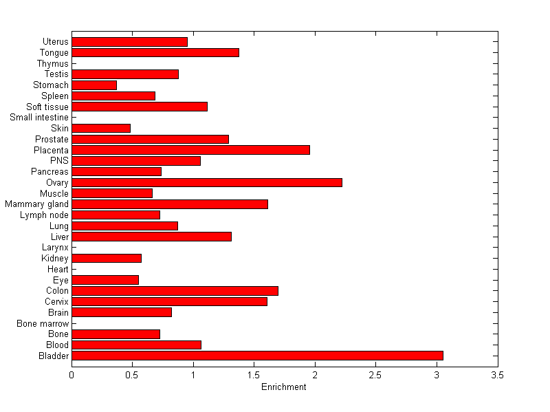 The expression level is normalized with tissue-library size. Each value for a gene in a tissue is a ratio of observed ESTs to the expected one in this tissue. The expected number of ESTs is the product of total ESTs of the gene and the fraction of total ESTs in the tissue among all ESTs in 30 tissues.