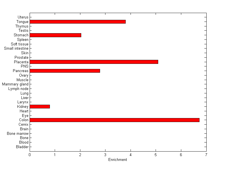 About the profile: The expression level is normalized with tissue-library size. Each value for a gene in a tissue is a ratio of observed ESTs to the expected one in this tissue. The expected number of ESTs is the product of total ESTs of the gene and the fraction of total ESTs in the tissue among all ESTs in 30 tissues. Summary: This gene is preferentially expressed in [colon, placenta] Download: |