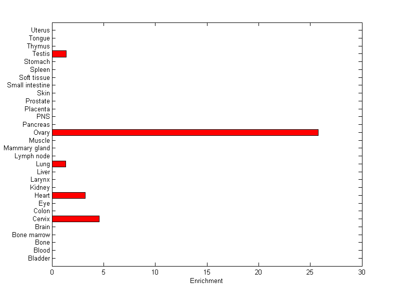 The expression level is normalized with tissue-library size. Each value for a gene in a tissue is a ratio of observed ESTs to the expected one in this tissue. The expected number of ESTs is the product of total ESTs of the gene and the fraction of total ESTs in the tissue among all ESTs in 30 tissues.