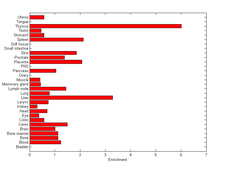 The expression level is normalized with tissue-library size. Each value for a gene in a tissue is a ratio of observed ESTs to the expected one in this tissue. The expected number of ESTs is the product of total ESTs of the gene and the fraction of total ESTs in the tissue among all ESTs in 30 tissues.