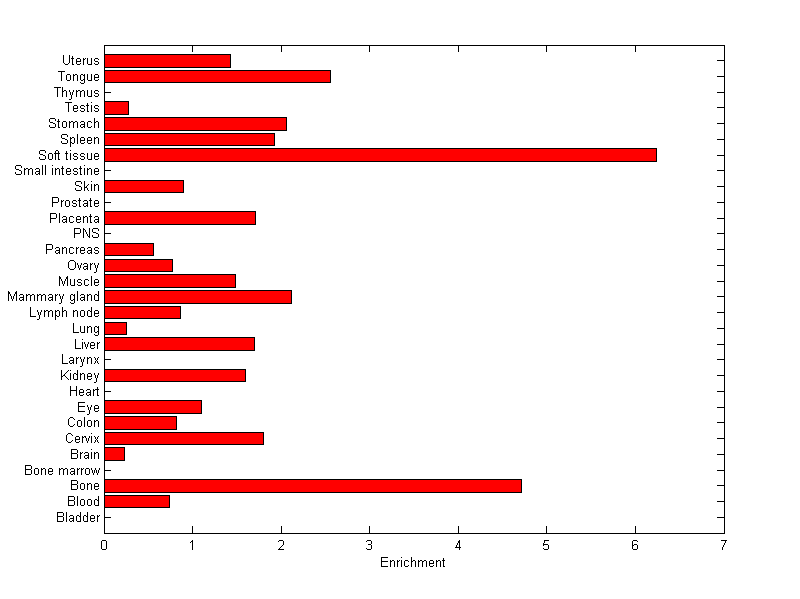 The expression level is normalized with tissue-library size. Each value for a gene in a tissue is a ratio of observed ESTs to the expected one in this tissue. The expected number of ESTs is the product of total ESTs of the gene and the fraction of total ESTs in the tissue among all ESTs in 30 tissues.