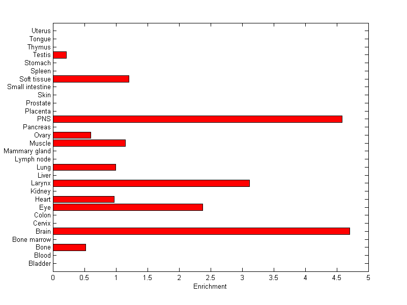 The expression level is normalized with tissue-library size. Each value for a gene in a tissue is a ratio of observed ESTs to the expected one in this tissue. The expected number of ESTs is the product of total ESTs of the gene and the fraction of total ESTs in the tissue among all ESTs in 30 tissues.