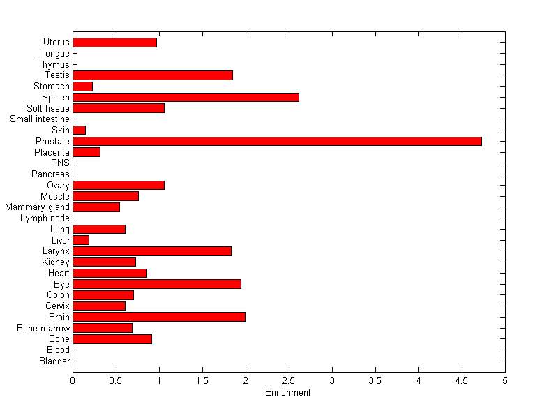 The expression level is normalized with tissue-library size. Each value for a gene in a tissue is a ratio of observed ESTs to the expected one in this tissue. The expected number of ESTs is the product of total ESTs of the gene and the fraction of total ESTs in the tissue among all ESTs in 30 tissues.