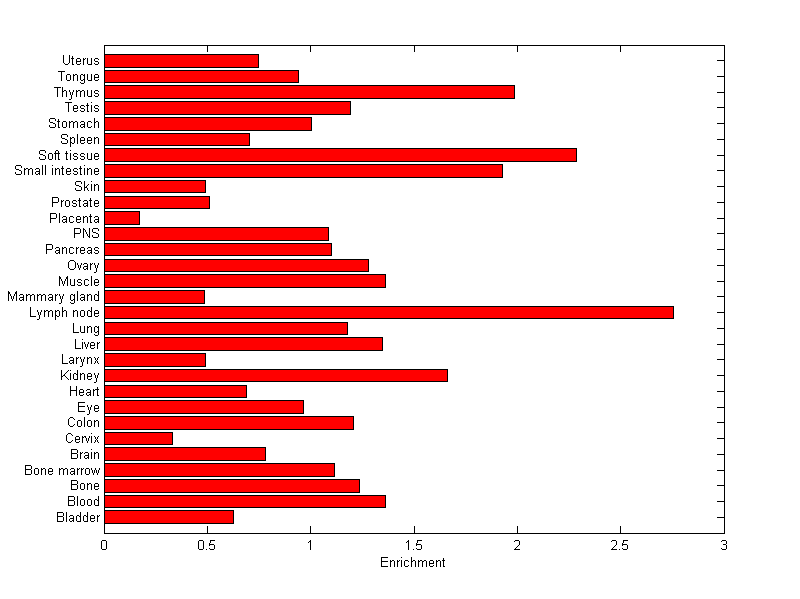 The expression level is normalized with tissue-library size. Each value for a gene in a tissue is a ratio of observed ESTs to the expected one in this tissue. The expected number of ESTs is the product of total ESTs of the gene and the fraction of total ESTs in the tissue among all ESTs in 30 tissues.
