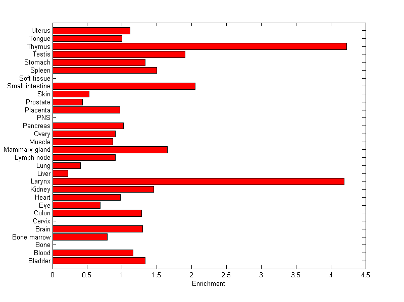 The expression level is normalized with tissue-library size. Each value for a gene in a tissue is a ratio of observed ESTs to the expected one in this tissue. The expected number of ESTs is the product of total ESTs of the gene and the fraction of total ESTs in the tissue among all ESTs in 30 tissues.