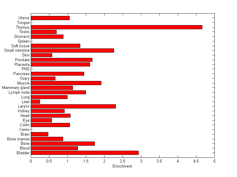 The expression level is normalized with tissue-library size. Each value for a gene in a tissue is a ratio of observed ESTs to the expected one in this tissue. The expected number of ESTs is the product of total ESTs of the gene and the fraction of total ESTs in the tissue among all ESTs in 30 tissues.