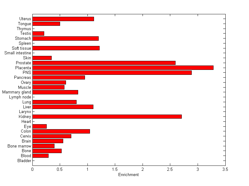 The expression level is normalized with tissue-library size. Each value for a gene in a tissue is a ratio of observed ESTs to the expected one in this tissue. The expected number of ESTs is the product of total ESTs of the gene and the fraction of total ESTs in the tissue among all ESTs in 30 tissues.