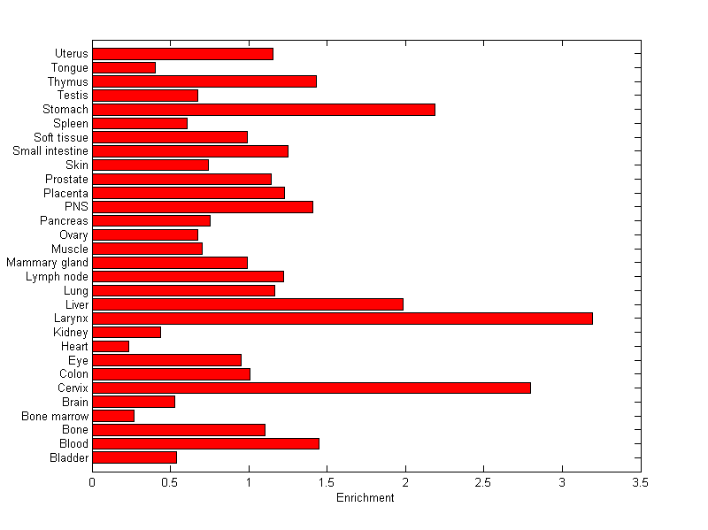 The expression level is normalized with tissue-library size. Each value for a gene in a tissue is a ratio of observed ESTs to the expected one in this tissue. The expected number of ESTs is the product of total ESTs of the gene and the fraction of total ESTs in the tissue among all ESTs in 30 tissues.