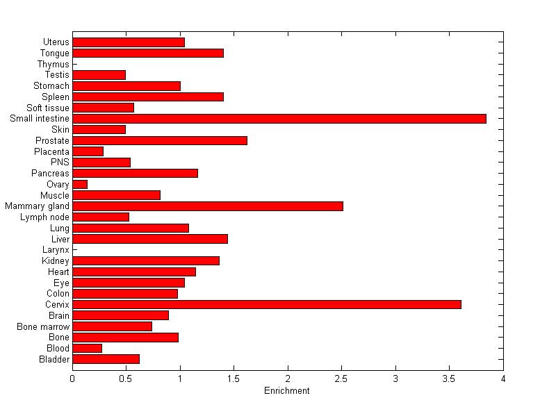 The expression level is normalized with tissue-library size. Each value for a gene in a tissue is a ratio of observed ESTs to the expected one in this tissue. The expected number of ESTs is the product of total ESTs of the gene and the fraction of total ESTs in the tissue among all ESTs in 30 tissues.