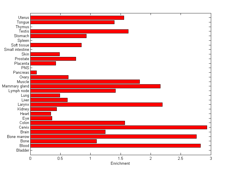 The expression level is normalized with tissue-library size. Each value for a gene in a tissue is a ratio of observed ESTs to the expected one in this tissue. The expected number of ESTs is the product of total ESTs of the gene and the fraction of total ESTs in the tissue among all ESTs in 30 tissues.