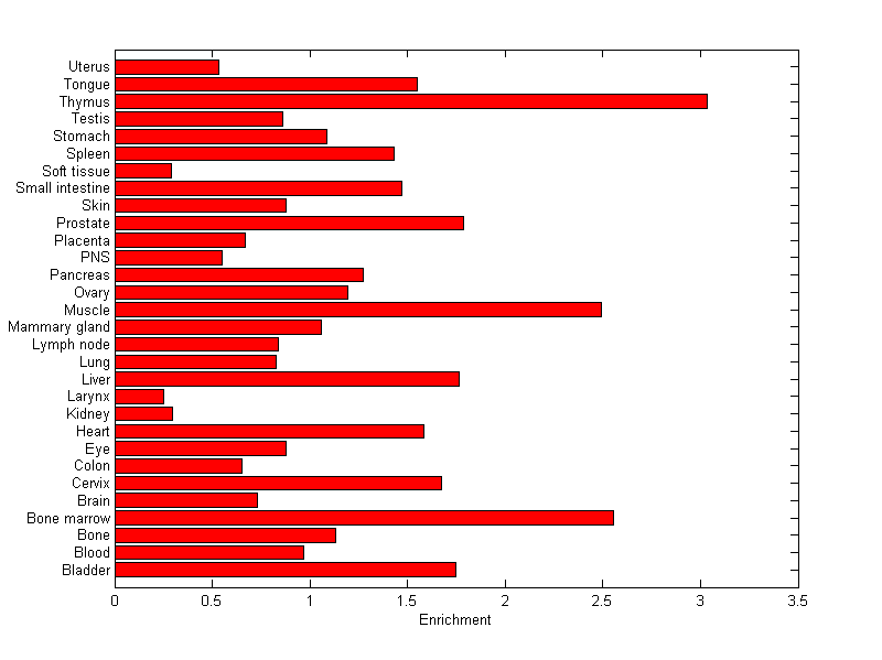 The expression level is normalized with tissue-library size. Each value for a gene in a tissue is a ratio of observed ESTs to the expected one in this tissue. The expected number of ESTs is the product of total ESTs of the gene and the fraction of total ESTs in the tissue among all ESTs in 30 tissues.