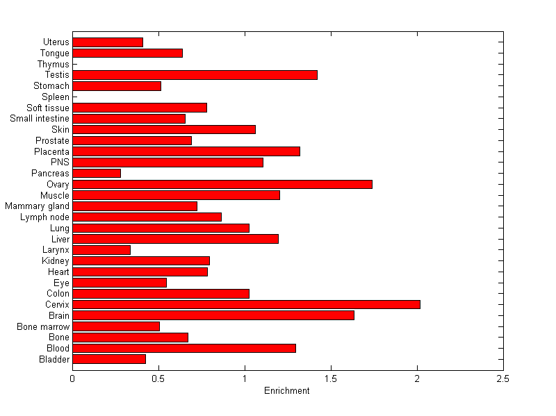 The expression level is normalized with tissue-library size. Each value for a gene in a tissue is a ratio of observed ESTs to the expected one in this tissue. The expected number of ESTs is the product of total ESTs of the gene and the fraction of total ESTs in the tissue among all ESTs in 30 tissues.