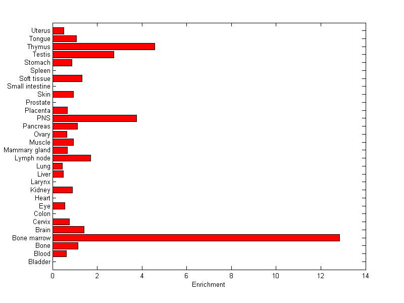 The expression level is normalized with tissue-library size. Each value for a gene in a tissue is a ratio of observed ESTs to the expected one in this tissue. The expected number of ESTs is the product of total ESTs of the gene and the fraction of total ESTs in the tissue among all ESTs in 30 tissues.