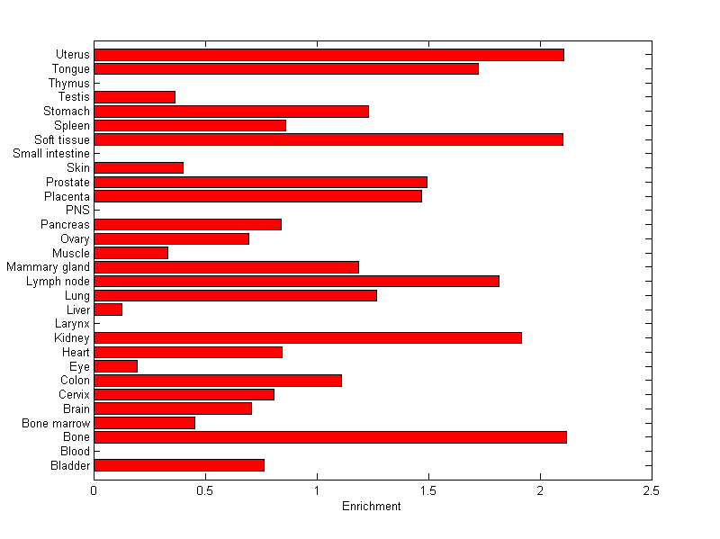 The expression level is normalized with tissue-library size. Each value for a gene in a tissue is a ratio of observed ESTs to the expected one in this tissue. The expected number of ESTs is the product of total ESTs of the gene and the fraction of total ESTs in the tissue among all ESTs in 30 tissues.