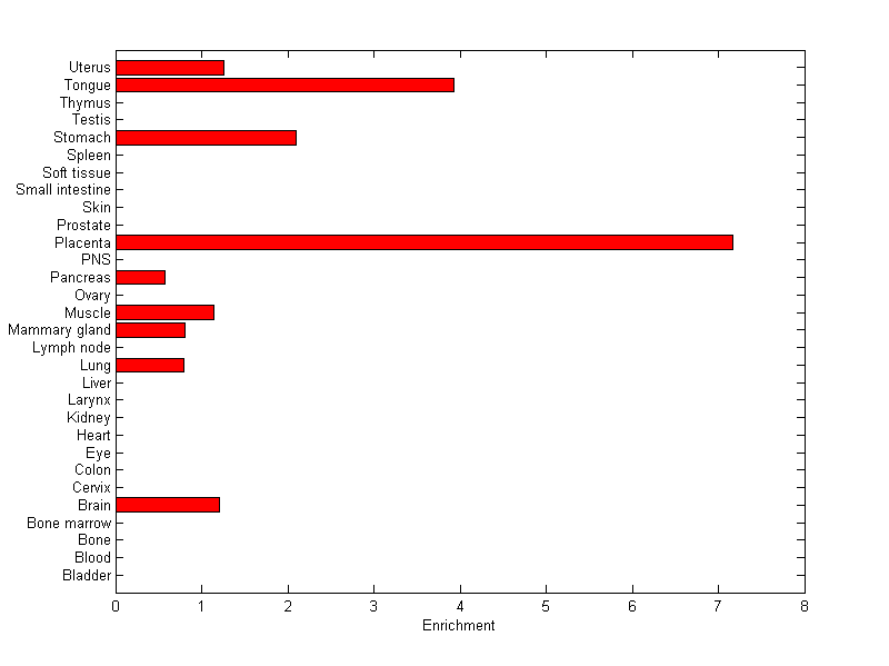 The expression level is normalized with tissue-library size. Each value for a gene in a tissue is a ratio of observed ESTs to the expected one in this tissue. The expected number of ESTs is the product of total ESTs of the gene and the fraction of total ESTs in the tissue among all ESTs in 30 tissues.