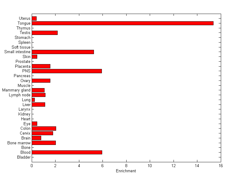 The expression level is normalized with tissue-library size. Each value for a gene in a tissue is a ratio of observed ESTs to the expected one in this tissue. The expected number of ESTs is the product of total ESTs of the gene and the fraction of total ESTs in the tissue among all ESTs in 30 tissues.