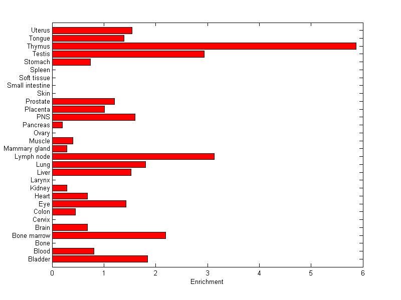 The expression level is normalized with tissue-library size. Each value for a gene in a tissue is a ratio of observed ESTs to the expected one in this tissue. The expected number of ESTs is the product of total ESTs of the gene and the fraction of total ESTs in the tissue among all ESTs in 30 tissues.