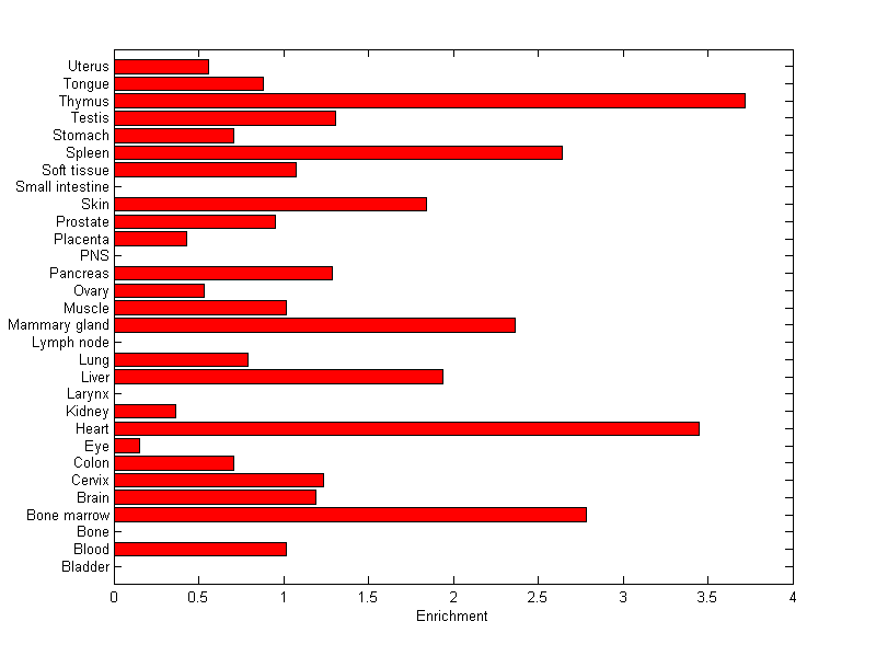 The expression level is normalized with tissue-library size. Each value for a gene in a tissue is a ratio of observed ESTs to the expected one in this tissue. The expected number of ESTs is the product of total ESTs of the gene and the fraction of total ESTs in the tissue among all ESTs in 30 tissues.