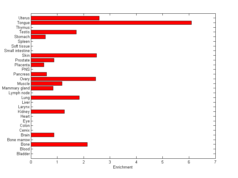 The expression level is normalized with tissue-library size. Each value for a gene in a tissue is a ratio of observed ESTs to the expected one in this tissue. The expected number of ESTs is the product of total ESTs of the gene and the fraction of total ESTs in the tissue among all ESTs in 30 tissues.
