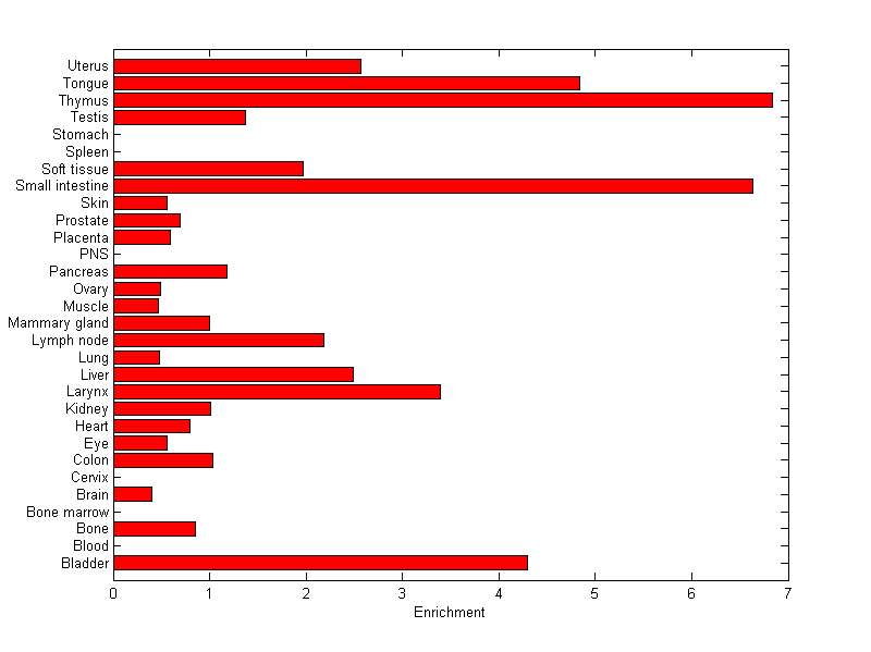 The expression level is normalized with tissue-library size. Each value for a gene in a tissue is a ratio of observed ESTs to the expected one in this tissue. The expected number of ESTs is the product of total ESTs of the gene and the fraction of total ESTs in the tissue among all ESTs in 30 tissues.