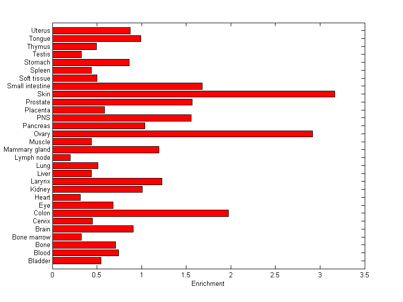 The expression level is normalized with tissue-library size. Each value for a gene in a tissue is a ratio of observed ESTs to the expected one in this tissue. The expected number of ESTs is the product of total ESTs of the gene and the fraction of total ESTs in the tissue among all ESTs in 30 tissues.