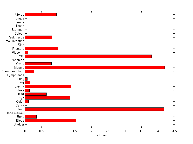 The expression level is normalized with tissue-library size. Each value for a gene in a tissue is a ratio of observed ESTs to the expected one in this tissue. The expected number of ESTs is the product of total ESTs of the gene and the fraction of total ESTs in the tissue among all ESTs in 30 tissues.