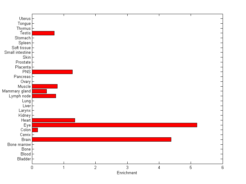 The expression level is normalized with tissue-library size. Each value for a gene in a tissue is a ratio of observed ESTs to the expected one in this tissue. The expected number of ESTs is the product of total ESTs of the gene and the fraction of total ESTs in the tissue among all ESTs in 30 tissues.