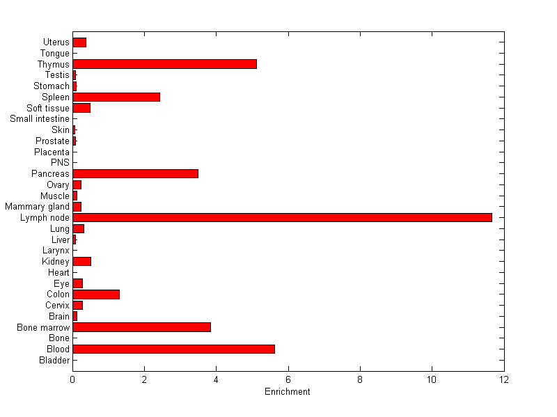 The expression level is normalized with tissue-library size. Each value for a gene in a tissue is a ratio of observed ESTs to the expected one in this tissue. The expected number of ESTs is the product of total ESTs of the gene and the fraction of total ESTs in the tissue among all ESTs in 30 tissues.