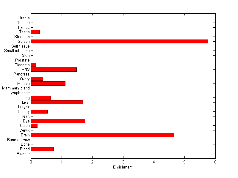 The expression level is normalized with tissue-library size. Each value for a gene in a tissue is a ratio of observed ESTs to the expected one in this tissue. The expected number of ESTs is the product of total ESTs of the gene and the fraction of total ESTs in the tissue among all ESTs in 30 tissues.
