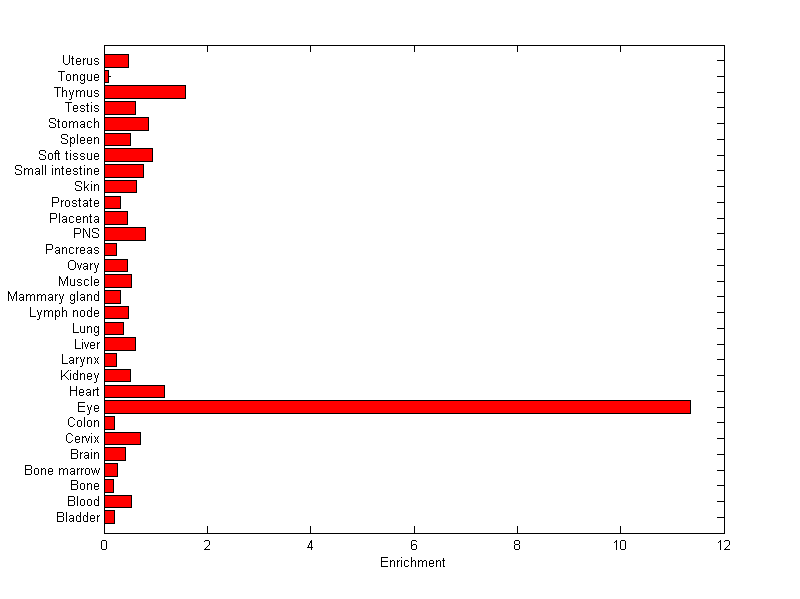 The expression level is normalized with tissue-library size. Each value for a gene in a tissue is a ratio of observed ESTs to the expected one in this tissue. The expected number of ESTs is the product of total ESTs of the gene and the fraction of total ESTs in the tissue among all ESTs in 30 tissues.