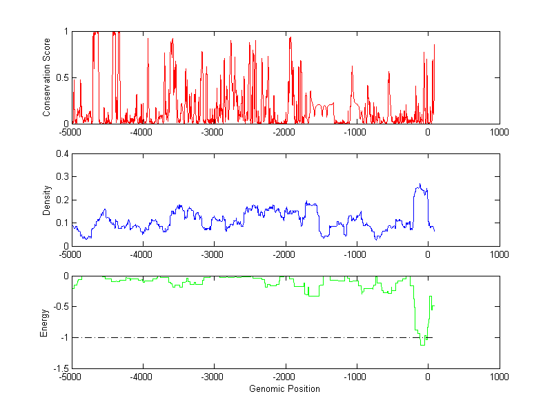 The energy profile (green curve) is about energy for module detection based on TF interaction. The positions with energy less than -1 indicate the existence of CRMs.