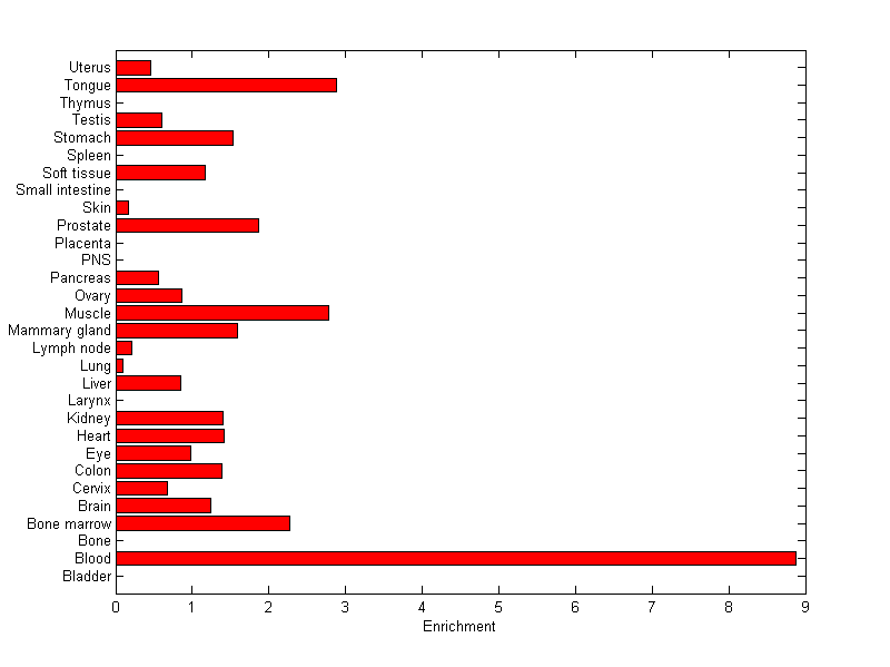 The expression level is normalized with tissue-library size. Each value for a gene in a tissue is a ratio of observed ESTs to the expected one in this tissue. The expected number of ESTs is the product of total ESTs of the gene and the fraction of total ESTs in the tissue among all ESTs in 30 tissues.