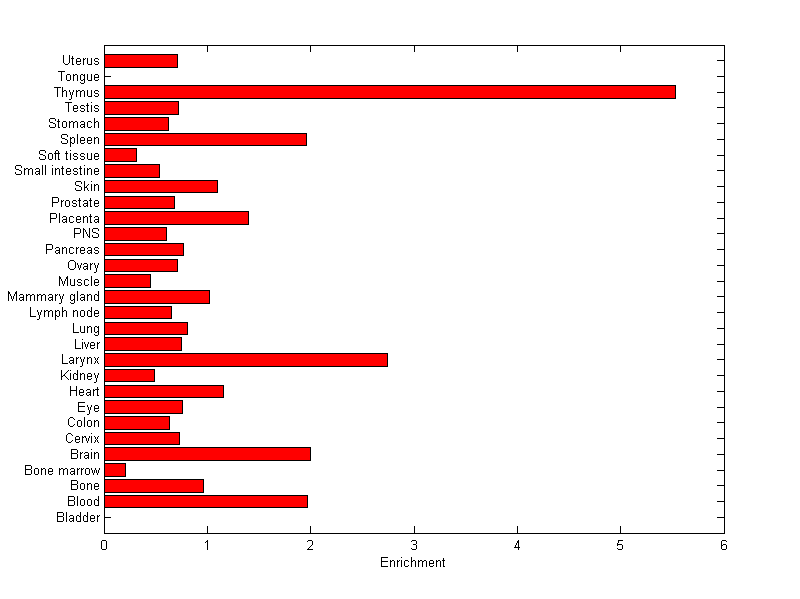 The expression level is normalized with tissue-library size. Each value for a gene in a tissue is a ratio of observed ESTs to the expected one in this tissue. The expected number of ESTs is the product of total ESTs of the gene and the fraction of total ESTs in the tissue among all ESTs in 30 tissues.
