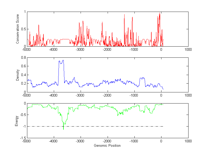 The energy profile (green curve) is about energy for module detection based on TF interaction. The positions with energy less than -1 indicate the existence of CRMs.